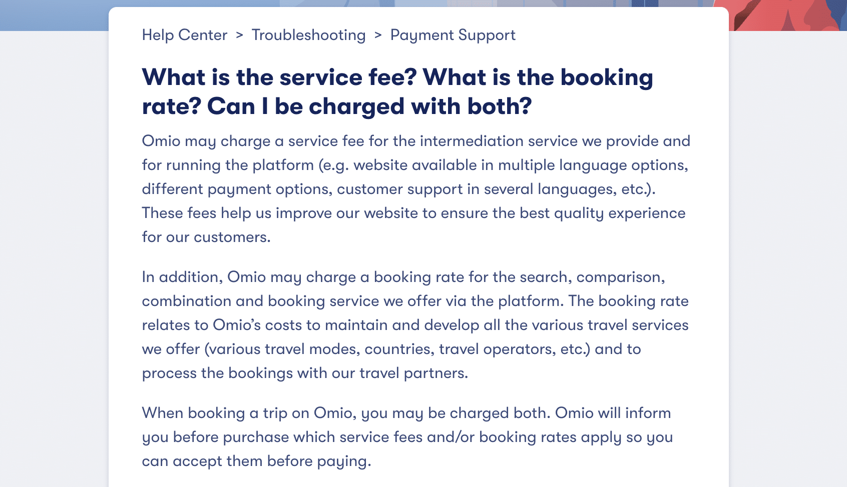 Omio may charge a service fee for using its platform. It may also charge a booking rate for search, comparison, booking, and processing services. These fees vary by booking and are shown before purchase. Omio says service fees are non refundable, while booking rates may be refunded if the user booked a refundable fare.